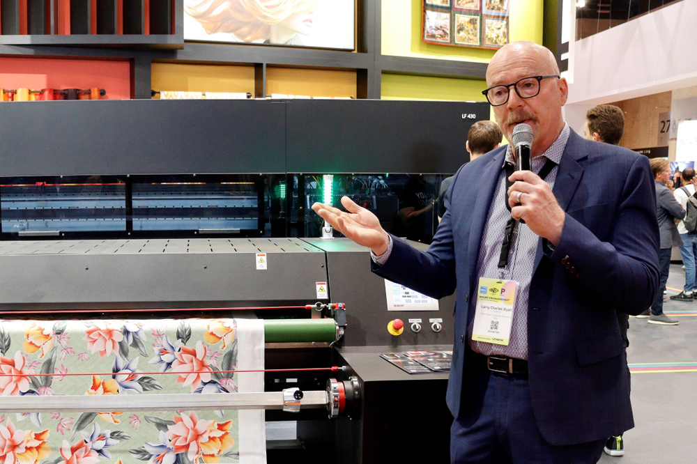 – Det er en alsidig flatbed-printer, med rulle-til-rulle-funktion, der er udviklet til at printe med exceptionel kvalitet, præcision og effektivitet, siger Larry Charles Wyatt, der viste rundt på standen.