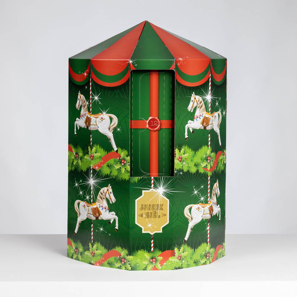 Kalenderen er anderledes ved, at den er interaktiv og kan dreje rundt som en rigtig karrusel. Den indeholder 24 omhyggeligt udvalgte halve flasker champagne. Selv når den er helt fyldt med flasker, drejer “hætten” rundt uden at indersiden skraber mod på grund af vægten.