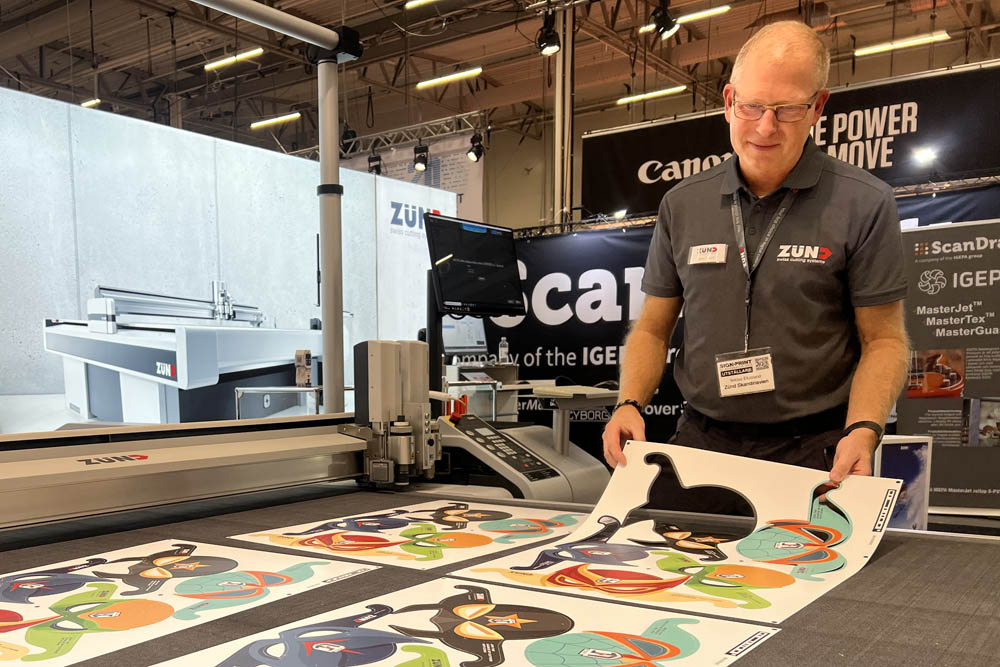På Sign&Print Scandinavia demonstrerer Zünd hvordan software-opdateringen og OCC’en sammen kan finde arkets præcise position og efterfølgende skære forskellige emner ud, som er printet på samme medie. Det sker dels ved hjælp af de særlige hjørnemærker, dels ved en special barcode, der fortæller om de præcise placeringer af elementerne og deres tilhørende skærefiler.